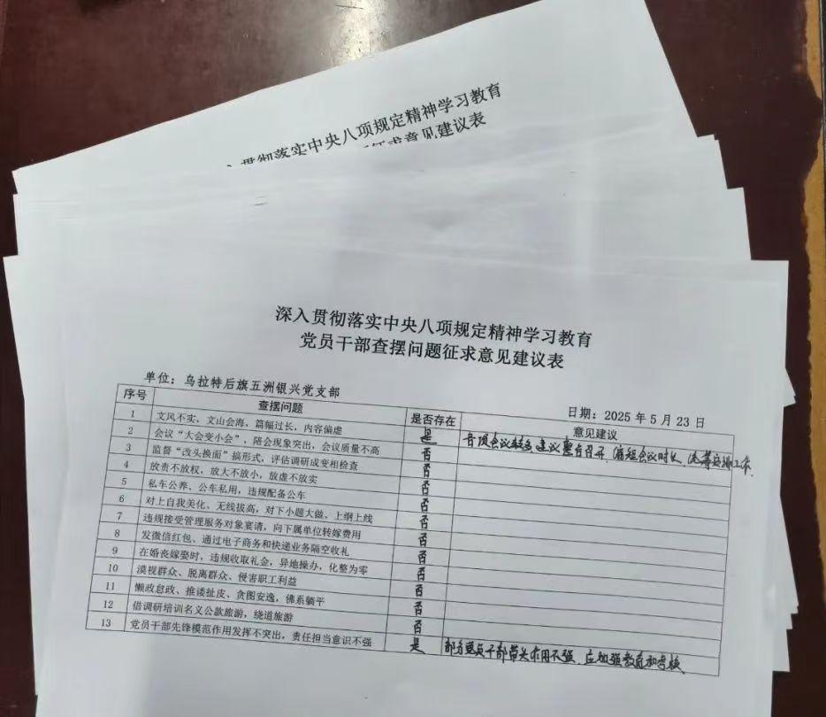 會上,大家對標習近平總書記關于加強黨的作風建設的重要論述和重要指示批示精神,對照《中央八項規(guī)定及其實施細則精神》,結合各自工作實際,堅持實事求是和問題導向原則,從思想引領、遵規(guī)守紀、作風建設、以學促干以及工作成效等方面做了全面查擺和自查自糾。同時緊扣中央八項規(guī)定內(nèi)容,從文風會風、推諉扯皮、擔當作為、公款旅游、隔空送禮等方面編制、印發(fā)了《黨員干部查擺問題征求意見表》,認真聽取黨員群眾的意見和建議。